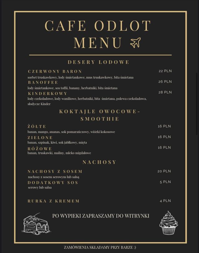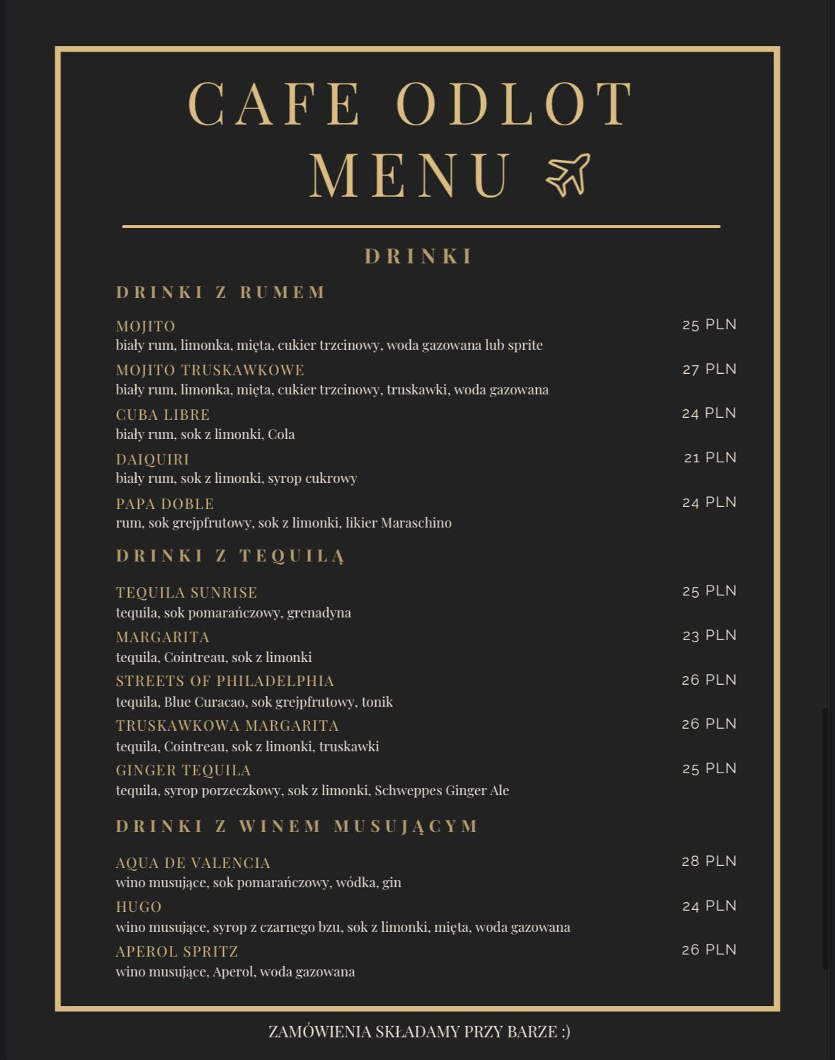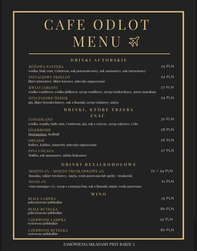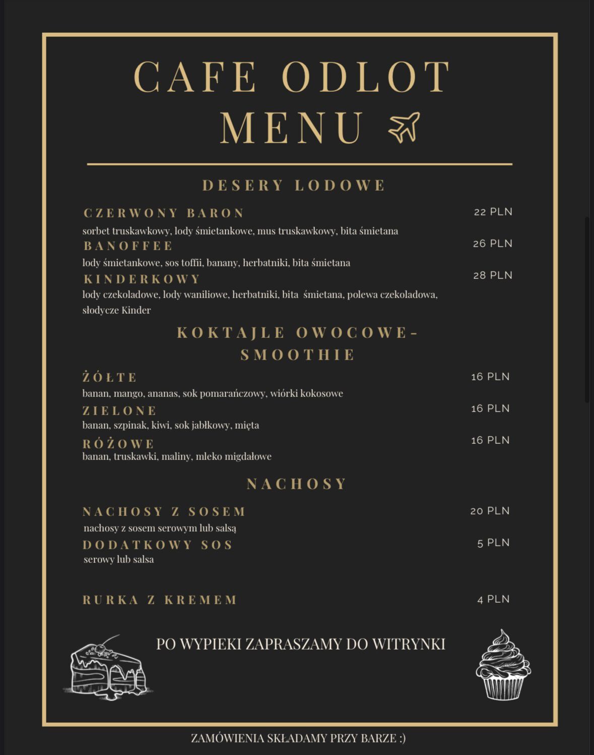 Ciągle się rozwijamy, tworzymy nowe pomysły i dbamy o to, by Cafe Odlot było miejscem wyjątkowym — dla tych, którzy chcą odpocząć, spotkać się, celebrować i po prostu dobrze spędzić czas.