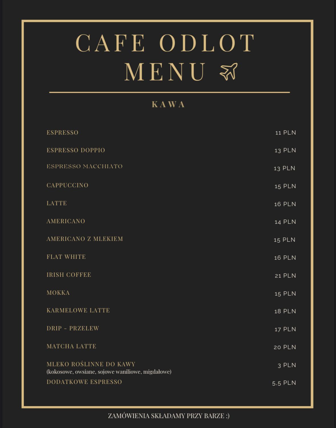 Cafe Odlot to kawiarnia i bar w jednym — miejsce, które żyje od rana do wieczora i zmienia swój klimat wraz z godziną. To przestrzeń stworzona z pasji do dobrej kawy, wyjątkowych smaków i atmosfery, która od pierwszej chwili sprawia, że czujesz się u siebie.